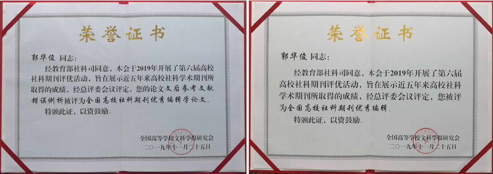 经教育部社科司批准,全国高等学校文科学报研究会2019年第六届全国高校社科期刊评优活动结束,我校学报荣获“全国高校社科优秀期刊”,郭华俊副编审荣获“全国高校社科期刊优秀编辑”和“全国高校社科期刊优秀编辑学论文”。